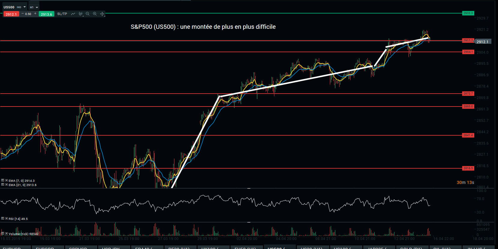 Le deuxième élément est le niveau du S&P500. En effet, en l’espace d’un trimestre nous avons comblé l’effondrement survenu fin 2018. Certains analystes avancent l’idée que le gros de la partie (à savoir la hausse) est d’ores et déjà derrière nous. Si nous nous referons à nos manuels, nous devons avoir en tête que les marchés intègrent toute l’information utile. Ainsi, nous anticipons une consolidation du S&P500 à court terme.