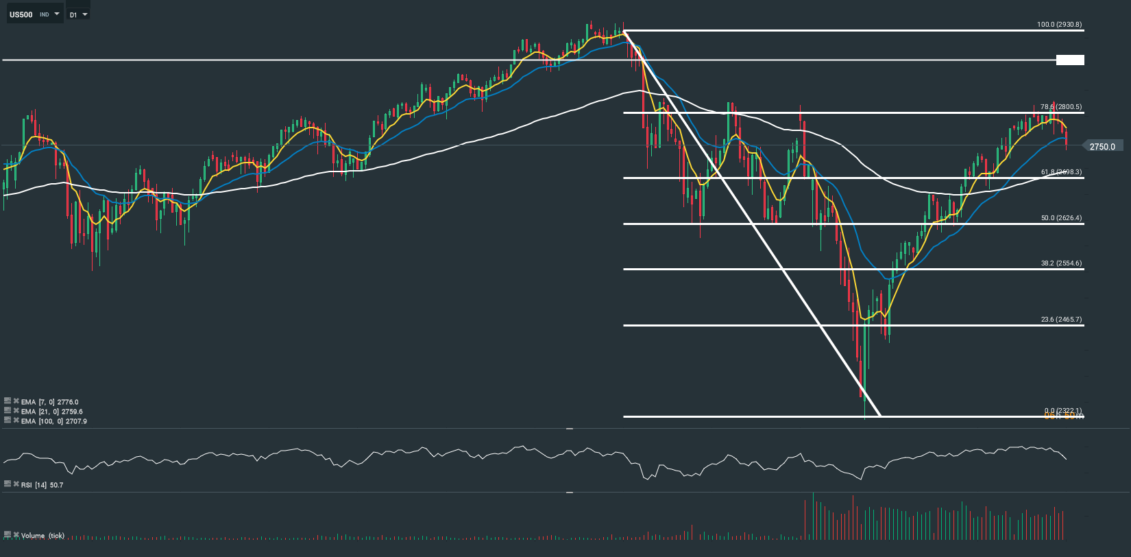 Sur le volet technique, sur un horizon journalier (D1), l’indice est toujours capé par le niveau des 2800 points. Les moyennes mobiles de court terme (7 et 21 périodes) ont été franchies vers le bas. Le RSI est orienté à la baisse. Nous avons un biais baissier sur l’indice américain.