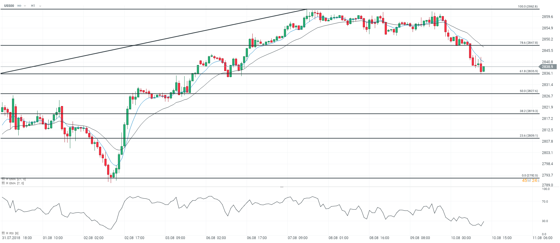 Pour l’heure, le contrat à terme sur l’indice S&P500 perd 0,45 % à 2 839 points. D’un point de vue technique, les prix évoluent en tendance baissière en unité de temps horaire (H1). En effet, nous remarquons sur le graphique ci-dessus que les cours sont capés par les moyennes mobiles à 7 et 21 périodes. Toutefois, nous faisons état de velléités haussières sur l’actif car les prix sont soutenus par le support correspondant au 61,8 % des retracements de Fibonacci. De plus, le RSI fluctue à l’intérieur de sa zone de survente. Pour conclure, nous estimons que les opérateurs pourraient amorcer un rebond technique de l’indice en direction des 78,6 % des retracements de Fibonacci à court terme, soit le niveau des 2 847 points.