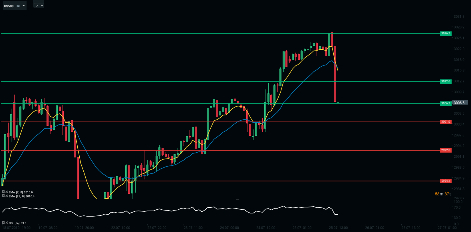 Pourtant, nous constatons que l’indice S&P500 (US500) cède du terrain après 30 minutes de cotation. Pourquoi cela ? Réponses : Mario Draghi et la Fed. En effet, le gouverneur de la BCE a estimé que les perspectives économiques sont “de pire en pire”, soulignant que les précédentes prévisions tablaient sur un rebond au T2, mais que les récents indicateurs pointent désormais plutôt vers la faiblesse. Il n’en faut pas plus pour effrayer les investisseurs. Enfin, de bonnes données macroéconomiques diminuent la probabilité de voir une baisse des Fed funds la semaine prochaine.