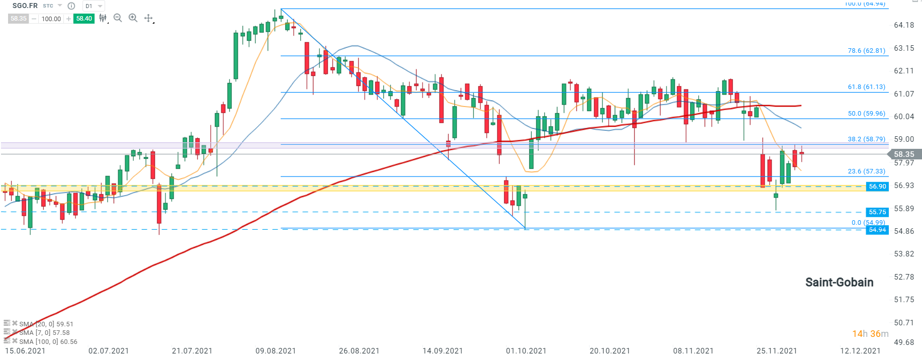 Les cours de Saint-Gobain (SGO.FR) ont progressé de plus de 50% depuis le début d’année et tentent de franchir le retracement de Fibonacci à 38,2% de la baisse entamée le 13/08/21, au moment de la rédaction de ces lignes. Toutefois, si les vendeurs prennent le contrôle, le retracement à 23,6% qui fait office de support serait à envisager. Source : xStation5