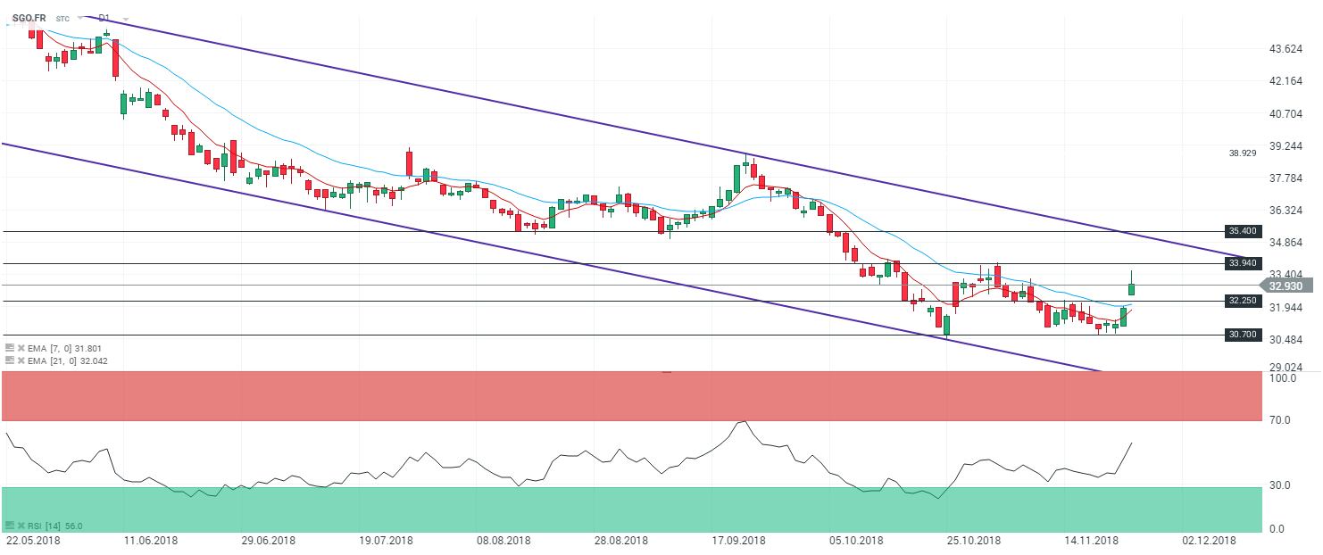 En unité de temps journalière (D1), le titre Saint-Gobain (SGO.FR) poursuit son évolution baissière au sein du canal baissier identifié depuis le mois de mai 2018. Le cours sont portés par les moyennes mobiles à 7 et 21 périodes. Le RSI est orienté à la hausse et oscille à 55,9 points. Dans ce contexte, nous avons un biais baissier sur le titre Saint-Gobain, avec comme objectif un retour sur le niveau des 30,70 € - et par extension le niveau des 28,50 €.