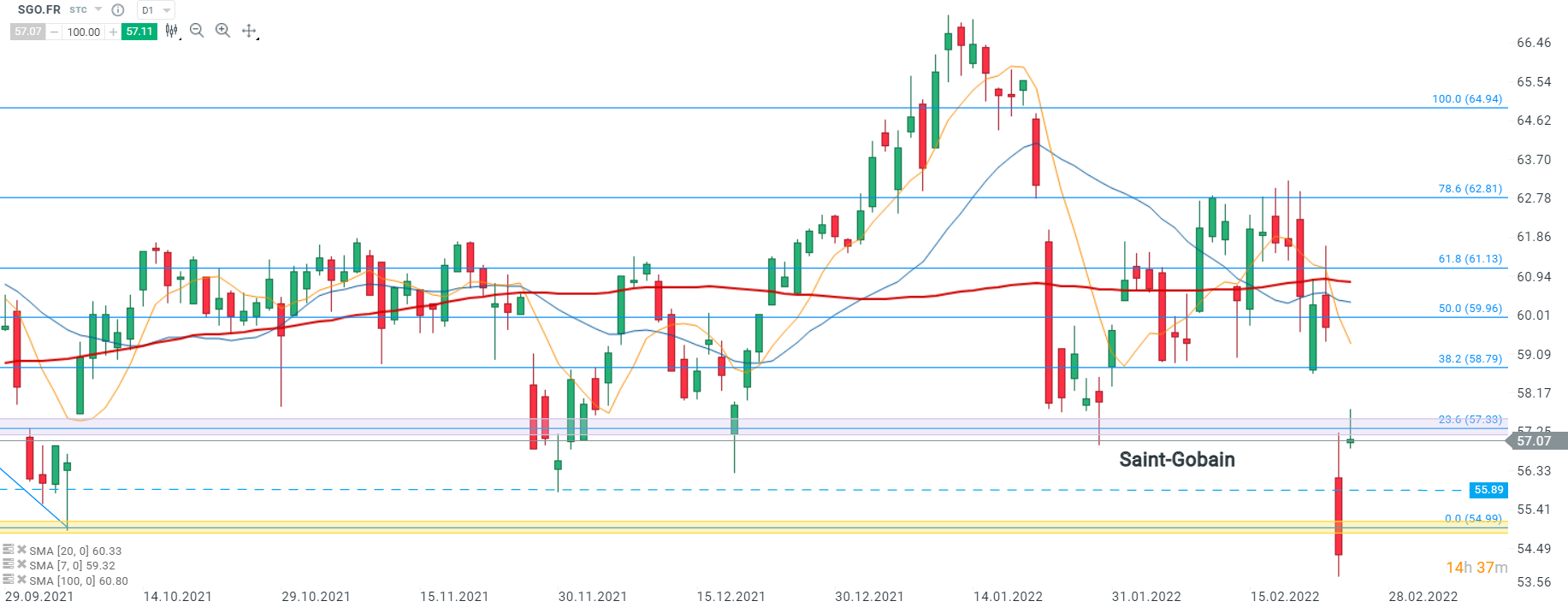 Les cours de Saint-Gobain (SGO.FR) ont entamé la dernière séance de la semaine à la hausse, tentant de franchir la résistance à 57,33 où coïncide le retracement de Fibonacci à 23,5% de la baisse d’août 2021, au moment de la rédaction de ces lignes. En cas d’échec, la zone de support à 55,89 serait à envisager. Source : xStation5