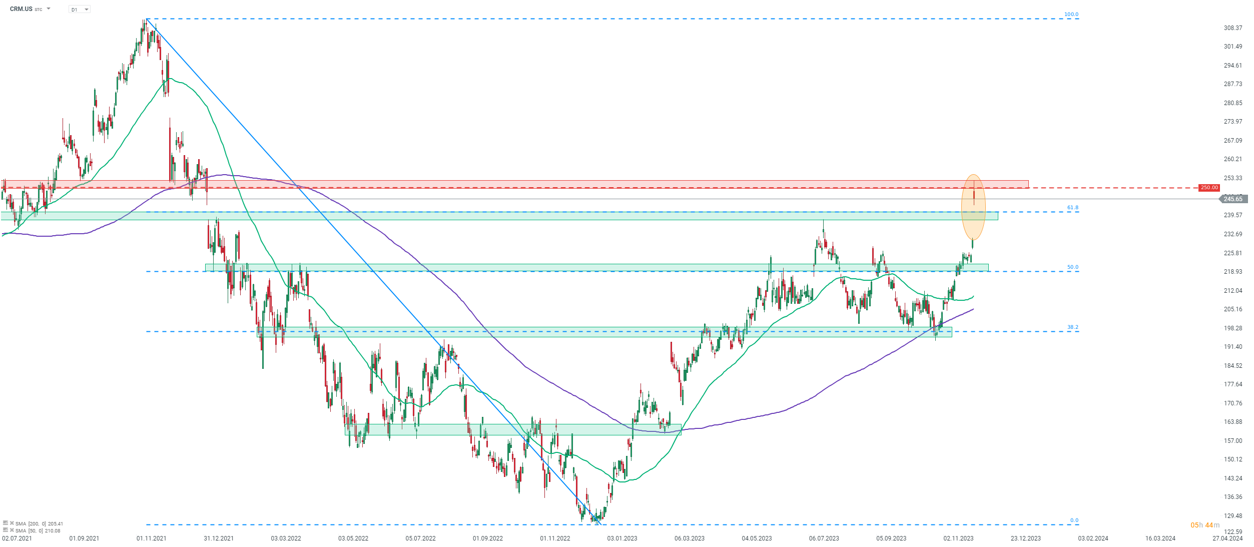 Salesforce (CRM.US) a progressé de plus de 6 % aujourd'hui suite à la publication d'un solide rapport sur les résultats du troisième trimestre fiscal 2024. Le cours de l'action atteint son plus haut niveau depuis le début de l'année 2022, car la stratégie de l'entreprise pour traverser le ralentissement des dépenses en technologies de l'information en améliorant ses marges semble fonctionner. Un niveau clé à surveiller à court terme est la zone de résistance à 250 dollars, que les taureaux ont tenté de franchir aujourd'hui mais ont échoué.