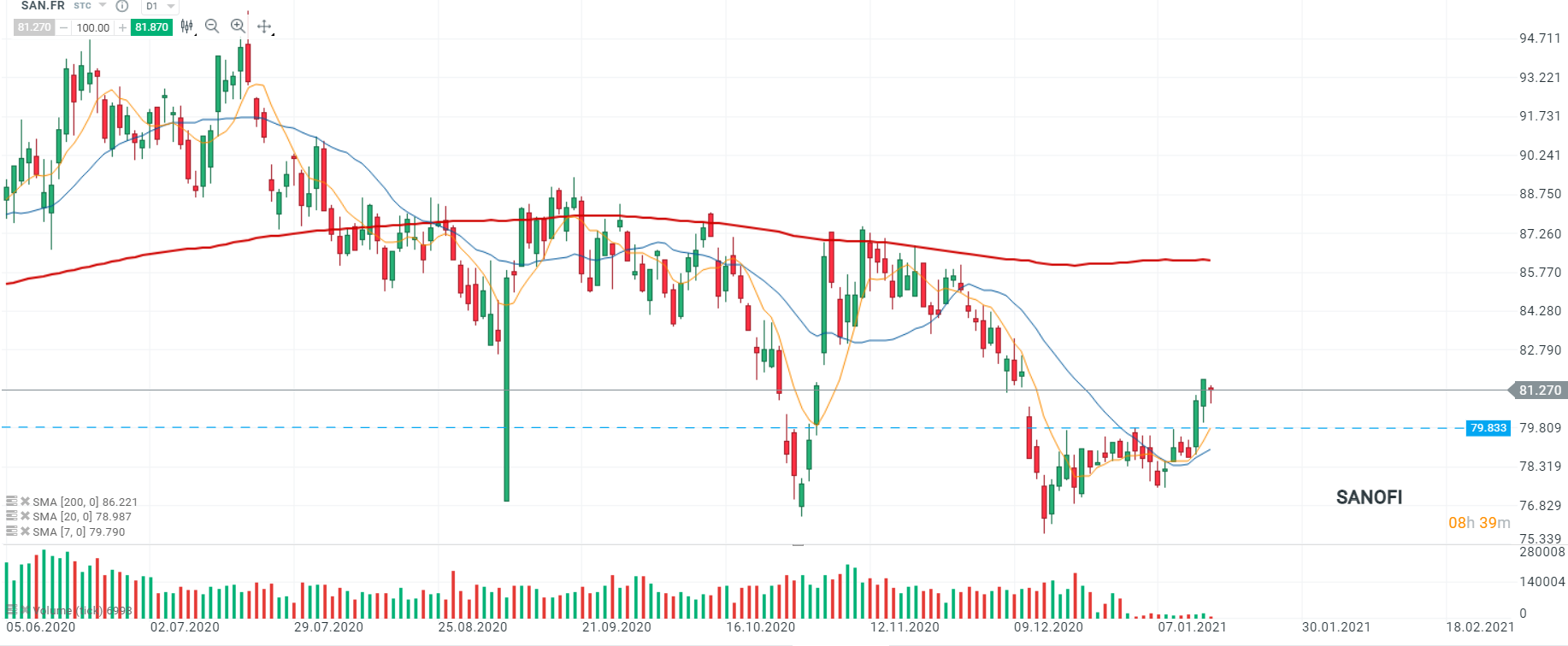 Les cours de Sanofi (SAN.FR) ont ouvert avec un léger gap baissier et se dirigent vers la zone de résistance au niveau des 79,833. Si le sentiment actuel prévaut et qu’une cassure en dessous du niveau mentionné ci-dessus devait se produire, le mouvement à la baisse pourrait s’accélérer vers la SMA 20 (ligne bleue) à 78,979. Source : xStation5