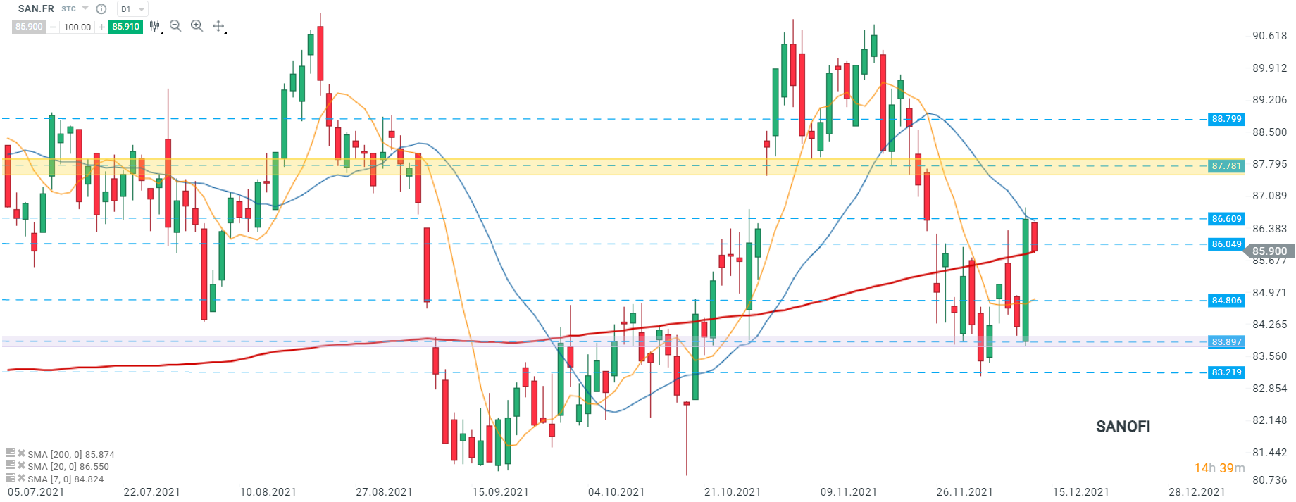 Les cours de Sanofi (SAN.FR) entament cette nouvelle semaine en baisse suite à la forte hausse lors de la séance de vendredi dernier. Toutefois, au moment de la rédaction de ces lignes, les cours tentent d’effacer les pertes et se dirigent vers la résistance à 86,609 où se trouve la SMA 20 (ligne bleue). En cas de franchissement, les cours pourraient aller chercher la prochaine résistance à 87,787. En cas d’échec, un retour au support à 86,049 serait à envisager. Source : xStation5