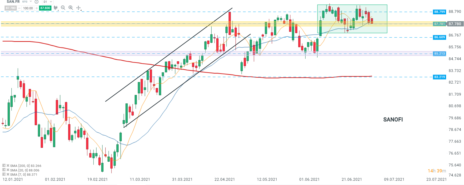 Les cours de Sanofi (SAN.FR) évoluent au sein d’un range avec pour borne inférieure 86,967 et pour borne supérieure 89,434. Au moment de la rédaction de ces lignes, les cours évoluent à la baisse, réalisant un test de la zone de support à 87,781. En cas de franchissement de ce niveau, le mouvement baissier pourrait s’étendre à la borne inférieure du range. Toutefois, si les acheteurs prennent le contrôle, la zone de résistance à 88,799 constitue la prochaine cible. Source : xStation5