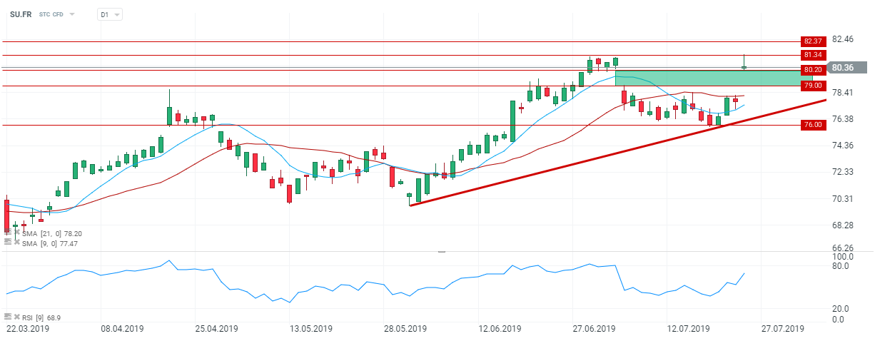Schneider Electric (SU.FR) prend la tête du CAC 40 et bondit de plus de 3.30 % à 80.10 Euros, suite à la très bonne publication de ses résultats du premier semestre et au relèvement de ses objectifs pour l’année 2019.