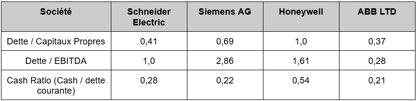 Mais une forte croissance ne suffit pas à rassurer les investisseurs : elle doit s'accompagner d'un bilan solide pour garantir la stabilité financière de l’entreprise. Sur ce point, Schneider Electric offre des garanties remarquables. Son ratio dette/capitaux propres s’élève à 0,41, le deuxième plus faible parmi ses concurrents, juste derrière ABB Ltd. De même, son ratio Dette / EBITDA fait partie des plus faibles. Son ratio de cash est quant à lui en ligne avec ses pairs.