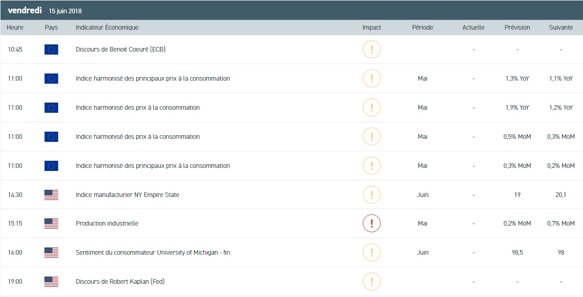 Cette séance sera placée sous le signe des quatre sorcières marquant l’arrivée à échéance des futures et options sur actions et indices. Les volumes d’échanges pourraient donc augmenter en cette fin de semaine. Wall Street a clôturé jeudi en territoire positif avec un nouveau record pour le Nasdaq. Par ailleurs, le département du Commerce américain a fait état d’une forte augmentation des ventes au détail au mois de mai alors que les inscriptions hebdomadaires au chômage reculent contre toute attente. Les opérateurs ont également salué le biais accommodant de la Banque centrale européenne (BCE). Cependant, le secteur bancaire a été pénalisé tandis que les valeurs technologiques ont affiché de bonnes performances. En Europe, les indices ont terminé en forte hausse grâce à la chute de l’euro sur le marché des changes. Ce repli est la conséquence directe de la décision de la BCE de ne pas relever ses taux directeurs avant la fin de l’été 2019. Ce biais favorise les valeurs exportatrices et fait reculer les rendements obligataires européens. Sur le marché asiatique, le Nikkei 225 a fini en hausse de 0,5% sur le niveau des 22 851 points suite aux annonces de la BCE et de la Banque du Japon. Cette dernière a laissé sa politique monétaire inchangée et a révisé à la baisse son estimation d’inflation.