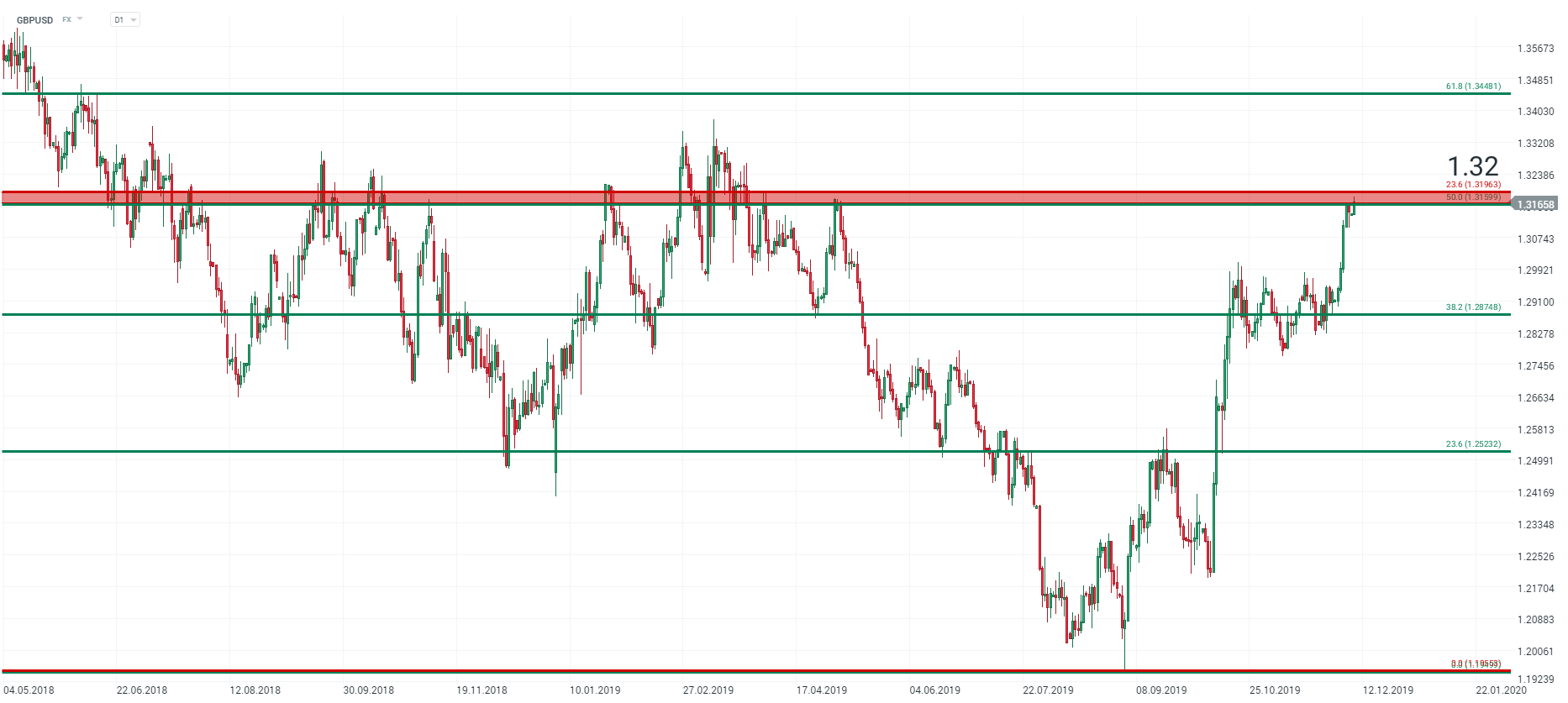 La livre sterling a atteint un plus haut niveau de 7 mois par rapport au dollar américain. La paire GBPUSD est notamment portée par les sondages montrant une majorité Conservative. Pour l’heure la paire vient tester sa résistance majeure des 1.32 $ matérialisée par un cluster de Fibonacci : 23 .6 % des retracements de long terme (mouvement baissier de juillet 2014 à septembre 2019) et des 50 % des retracements de moyen terme (mouvement baissier d’avril 2018 à septembre 2019). Attention cependant à un éventuel pullback des cours, souvenez-vous de l’adage : achetez la rumeur, vendez la nouvelle.