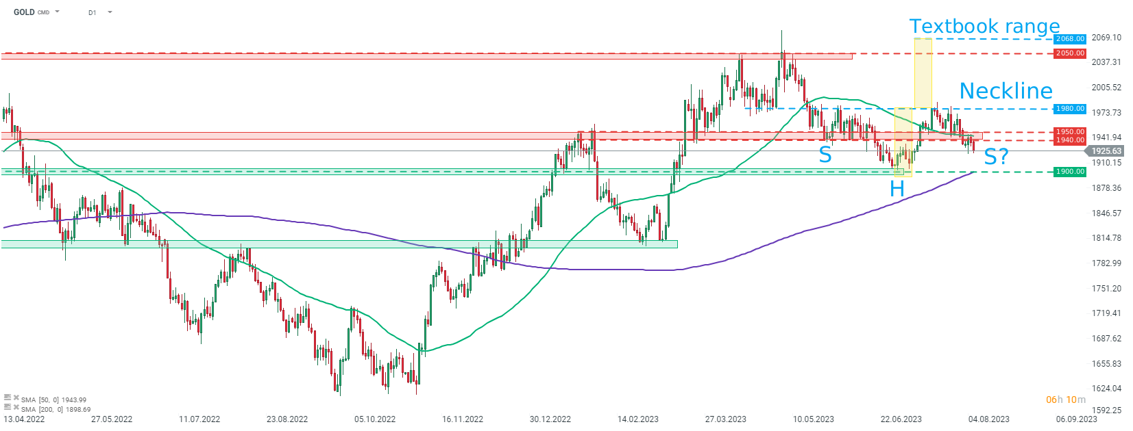 Le cours de l'or chute en dessous de la zone de prix de $1,940-1,950 aujourd'hui, invalidant probablement un potentiel modèle de tête et épaules inversées sur le graphique D1. Si la baisse ne s'arrête pas là, la zone de support à $1,900, marquée par les précédentes réactions de prix et la moyenne mobile sur 200 sessions (ligne violette), pourrait être en danger. D'autre part, si les haussiers parviennent à reprendre le contrôle et à se remettre des pertes, le modèle de tête et épaules inversées mentionné précédemment pourrait toujours se concrétiser. Source : xStation5.