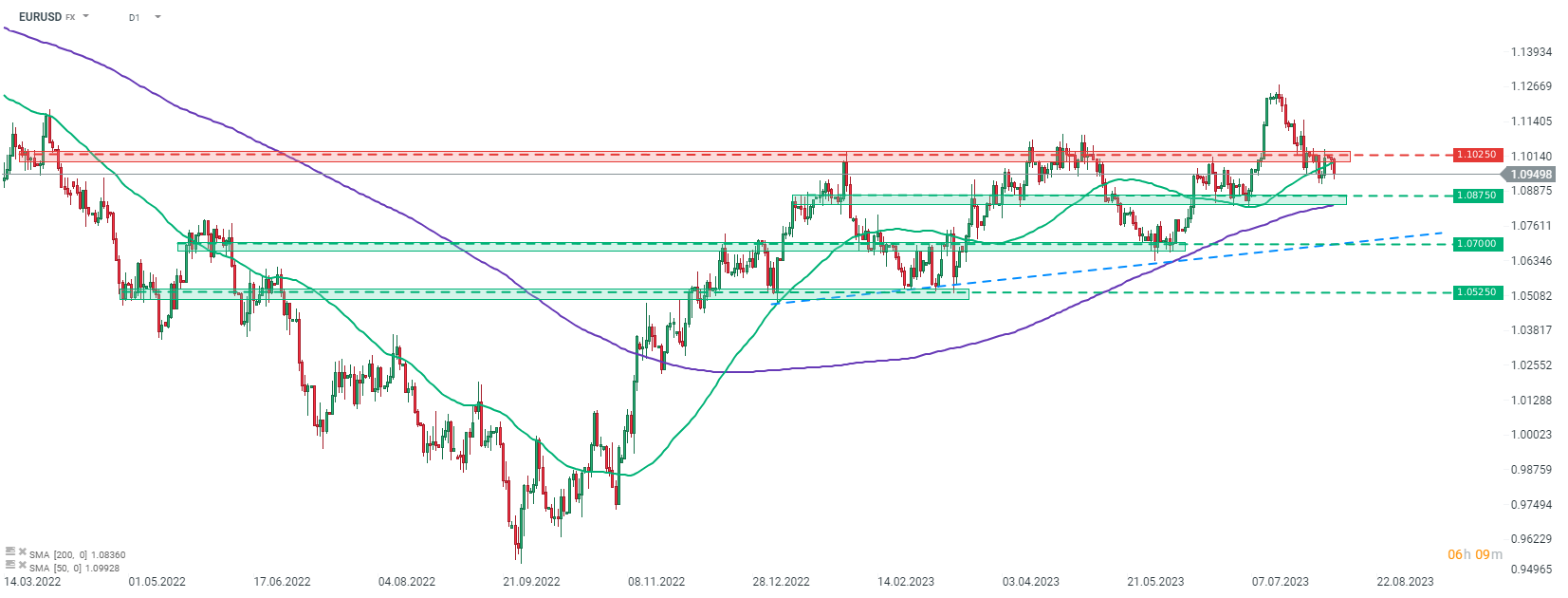 EURUSD n'a pas réussi à repasser au-dessus de la zone de résistance de 1.1025, marquée par les précédents sommets locaux et la moyenne mobile sur 50 sessions (ligne verte). La paire chute aujourd'hui alors que l'USD se renforce avec des flux vers les valeurs refuges. Si nous observons une rupture en dessous des récents creux locaux dans la zone de 1.0920, le prochain objectif pour les baissiers sera la zone de support de 1.0875. Source : xStation5.