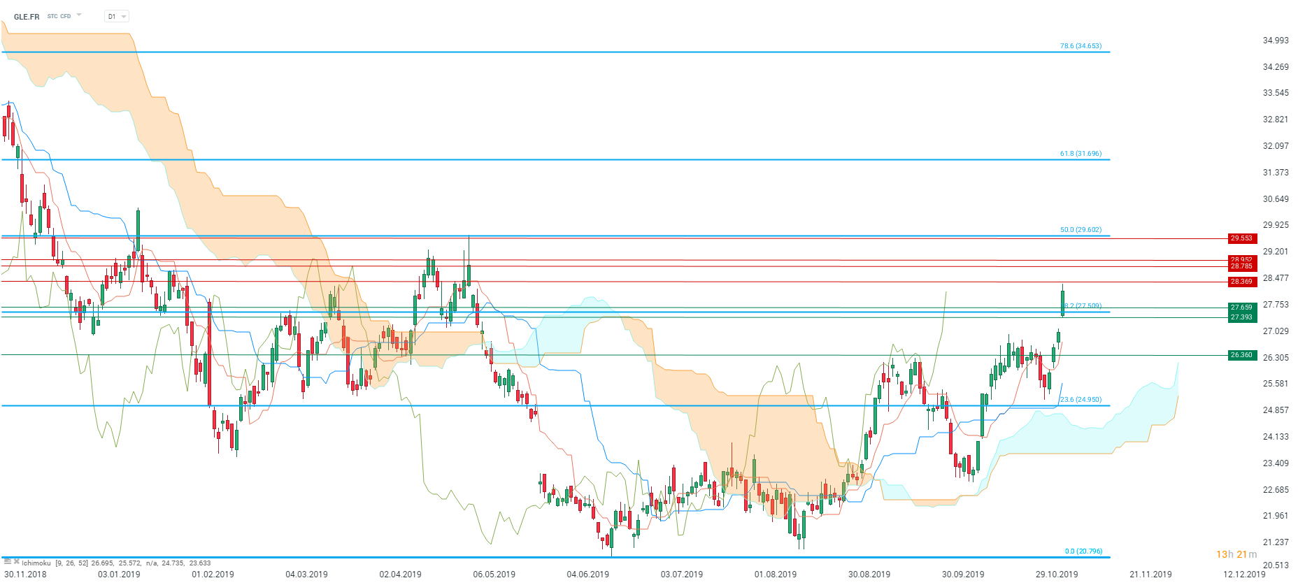 Pour l’heure, les investisseurs semblent saluer le fait que Société Générale ait réussi à renfoncer son niveau de capital. Le titre bondit de plus de 4.50 % pour s’échanger autour des 28.20 €. D’un point de vue technique, les cours se sont affranchir d’une importante zone de résistance qui fera désormais office de support et qui correspond aux 38.2 % des retracements de Fibonacci, à un plat de Kijun et un plat de Tenkan autour des 27.50 €. Les prix semblent désormais de diriger vers la prochaine zone de résistance majeure constituée par les 50 % des retracements de Fibonacci et par le plat de SSB autour des 29.50 €. Cependant les cours rencontreront plusieurs résistances à savoir : un plat de Tenkan situé autour des 28.40 €, et un plat de Tenkan et de SSB autour de la zone des 28.90 €.