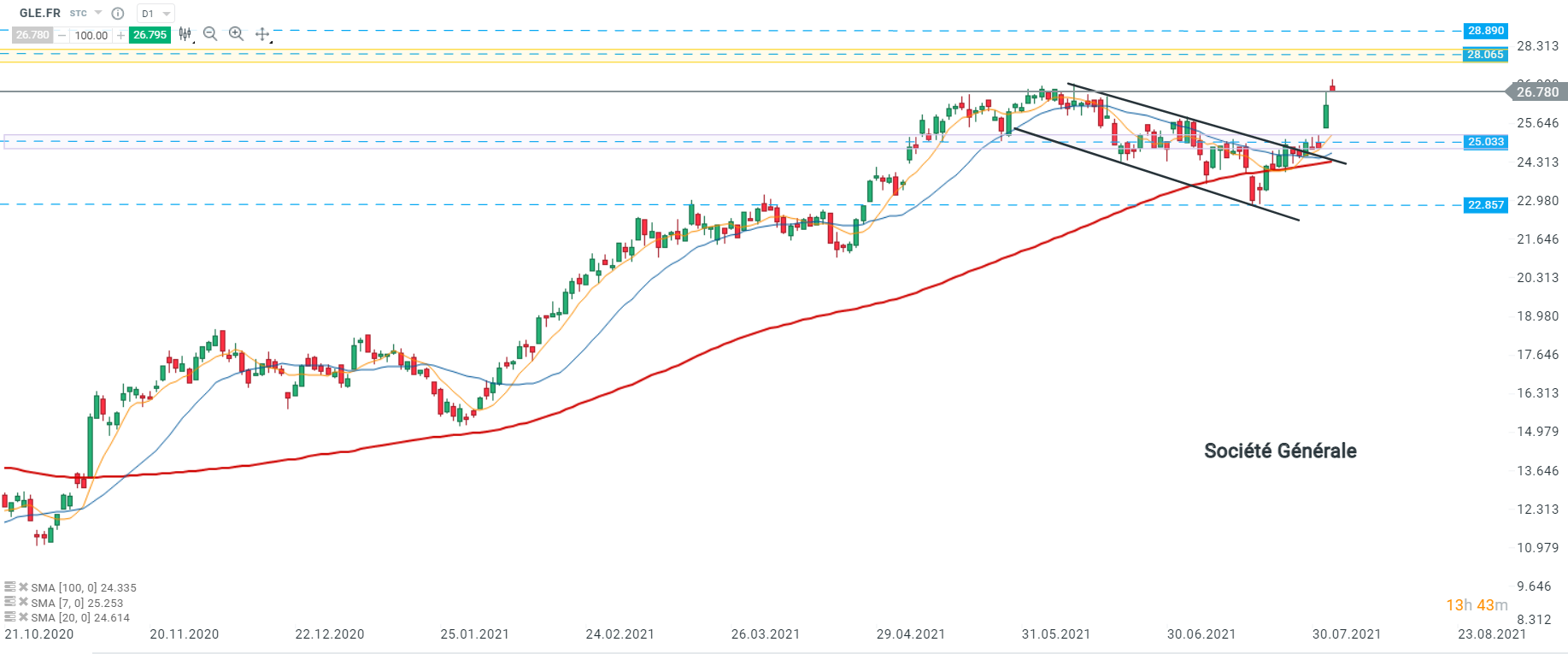 Les cours de Société Générale (GLE.FR) ont ouvert pour la deuxième séance consécutive avec un gap haussier après être sortis à la hausse de leur formation en drapeau le 26/07. Si le sentiment actuel prévaut, le mouvement haussier pourrait s’étendre en direction du sommet du 27/02 à 28,065. Toutefois, si les vendeurs prennent le contrôle, un retour à la borne supérieure du canal à 25,033 serait à envisager. Source : xStation5
