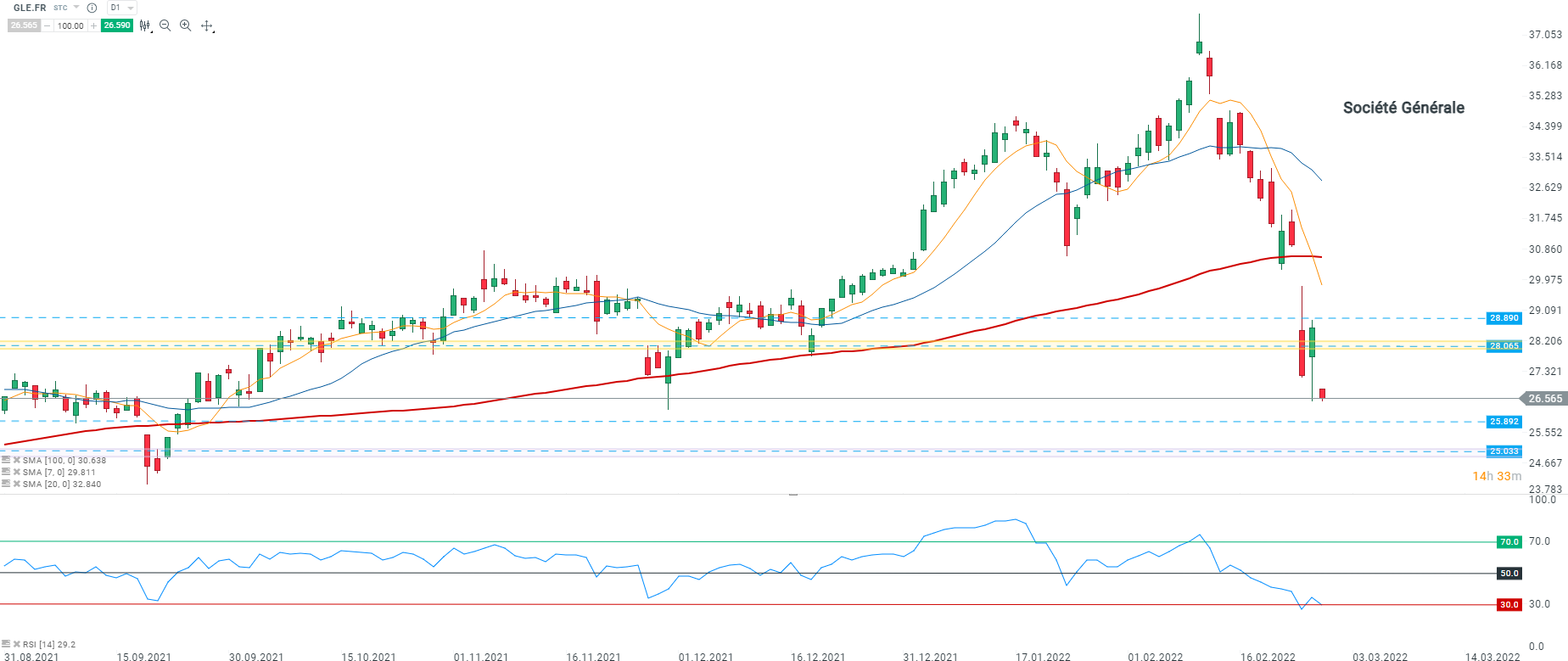 Les cours de Société Générale (GLE.FR) ont entamé la première session de la semaine avec un important gap baissier suite à l’invasion de l’Ukraine par la Russie, Société Générale possédant la banque russe Rosbank. Au moment de la rédaction de ces lignes, les cours se dirigent vers la zone de support à 25,892. De plus, le RSI se situe sous sa zone de neutralité, signifiant que le momentum est vendeur. Toutefois, si les acheteurs venaient à prendre le contrôle, la résistance à 28,065 serait à envisager. Source : xStation5