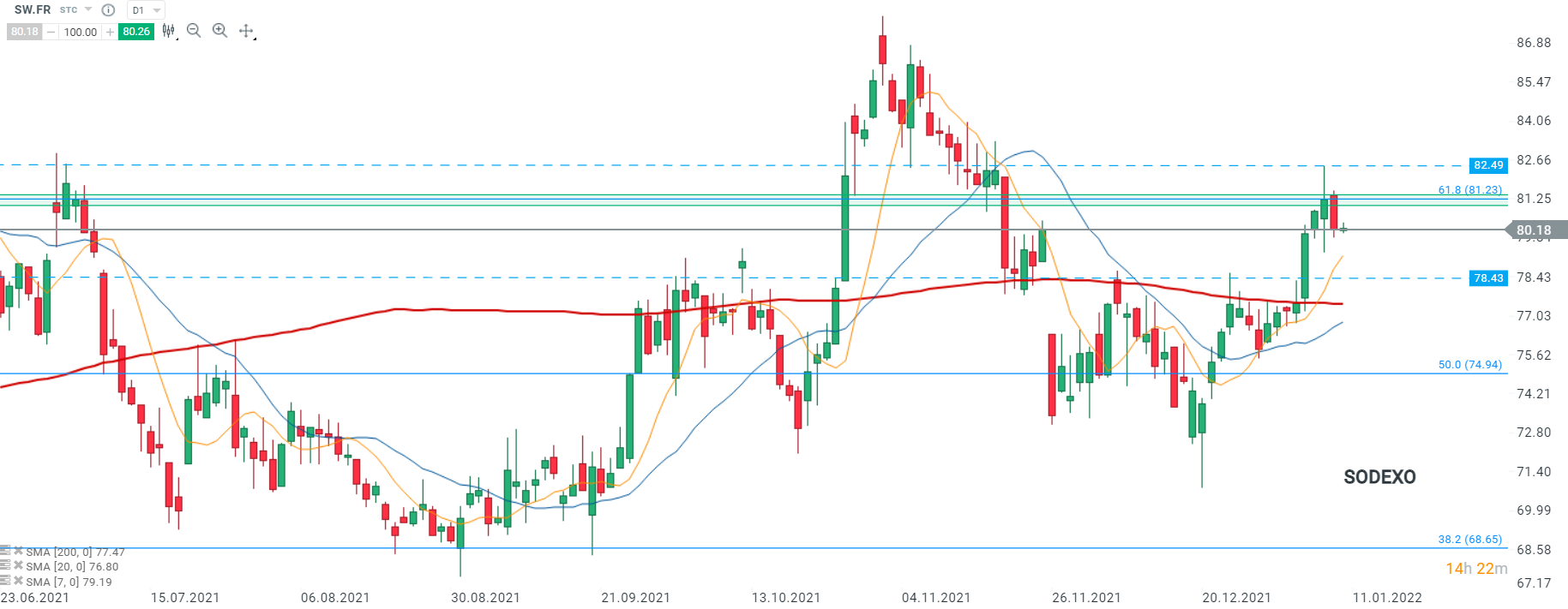 Les cours de Sodexo (SW.FR) ont ouvert à la hausse suite à la nouvelle de l’acquisition, se dirigeant vers le retracement de Fibonacci à 61,8% de la chute de février 2020. En cas de succès, le mouvement haussier pourrait s’étendre en direction de la résistance à 82,49. Toutefois, en cas d’échec, un retour au support majeur de 78,43 ne peut être exclu. Source : xStation5