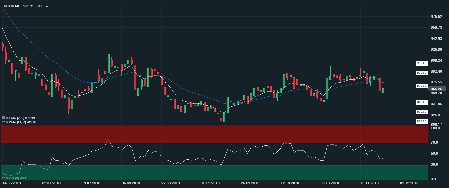 En unité de temps journalière (D1), le soja (SOYBEAN) évolue au sein de sa zone de range comprise entre 890 et 815 $. Les cours sont capés par leurs moyennes mobiles à 7 et 21 périodes. Le RSI est orienté à la hausse et oscille à 40,5 points. Dans ce contexte, nous serons baissiers sur l’actif, avec comme objectif le niveau des 845 $ - puis le niveau des 830 $ par extension.