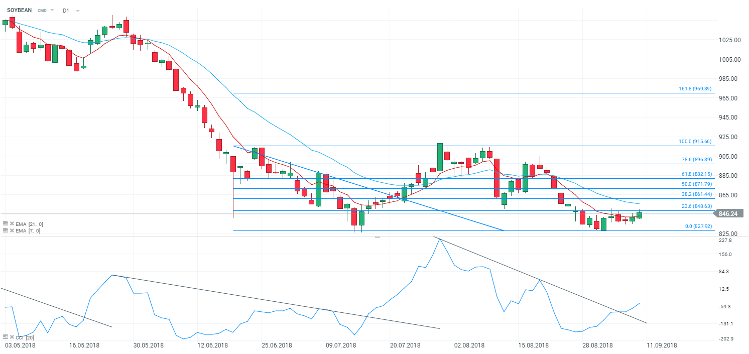 Le soja en unité de temps journalière (D1), oscille depuis plusieurs jours dans une fourchette de prix comprise entre 828 $ et 850 $. Depuis le début de ce mois de septembre, nous remarquons qu’après avoir touché leurs plus bas, les prix sont orientés à la hausse. A présent, les prix sont portés par la moyenne mobile à 7 périodes. De plus, le CCI s’est affranchi de sa résistance oblique. Les prix cherchent à présent à casser le niveau des 23,6% des retracements de Fibonnaci. En considérant l’ensemble des éléments susmentionnées, nous avons un biais haussier sur le soja, avec en ligne de mire dans un premier temps le niveau des 860 $ - qui correspond au 38,2% des retracements de Fibonnaci. Puis dans un second temps, nous irons chercher les 870 $.