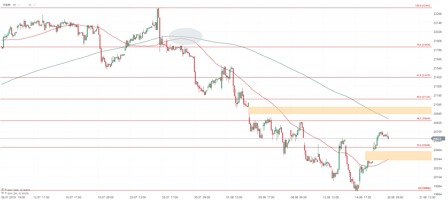 Contrairement aux autres indices européens, l’indice italien évolue dans le rouge. Les cours se maintiennent au-dessus de la zone de support des 20500 points correspondant aux 23.6 % des retracements de Fibonacci. Les cours sont toujours capés par la moyenne mobile à 200 périodes Source : xStation5.