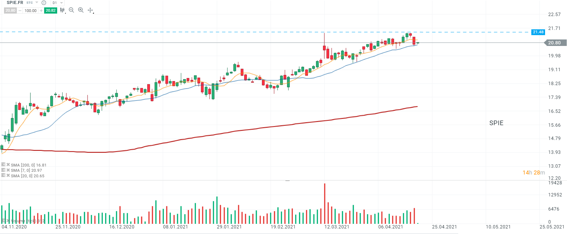Le titre SPIE (SPIE.FR) a gagné près de 17% depuis le début de l’année. Cependant, le repli des valeurs cycliques mardi a entraîné les cours vers la SMA 20. Les cours se dirigent vers la SMA 7 (ligne orange) au moment de la rédaction de ces lignes. En cas de cassure de ce niveau, le mouvement haussier pourrait s’étendre vers la zone de résistance au niveau des 21,48. Source : xStation5