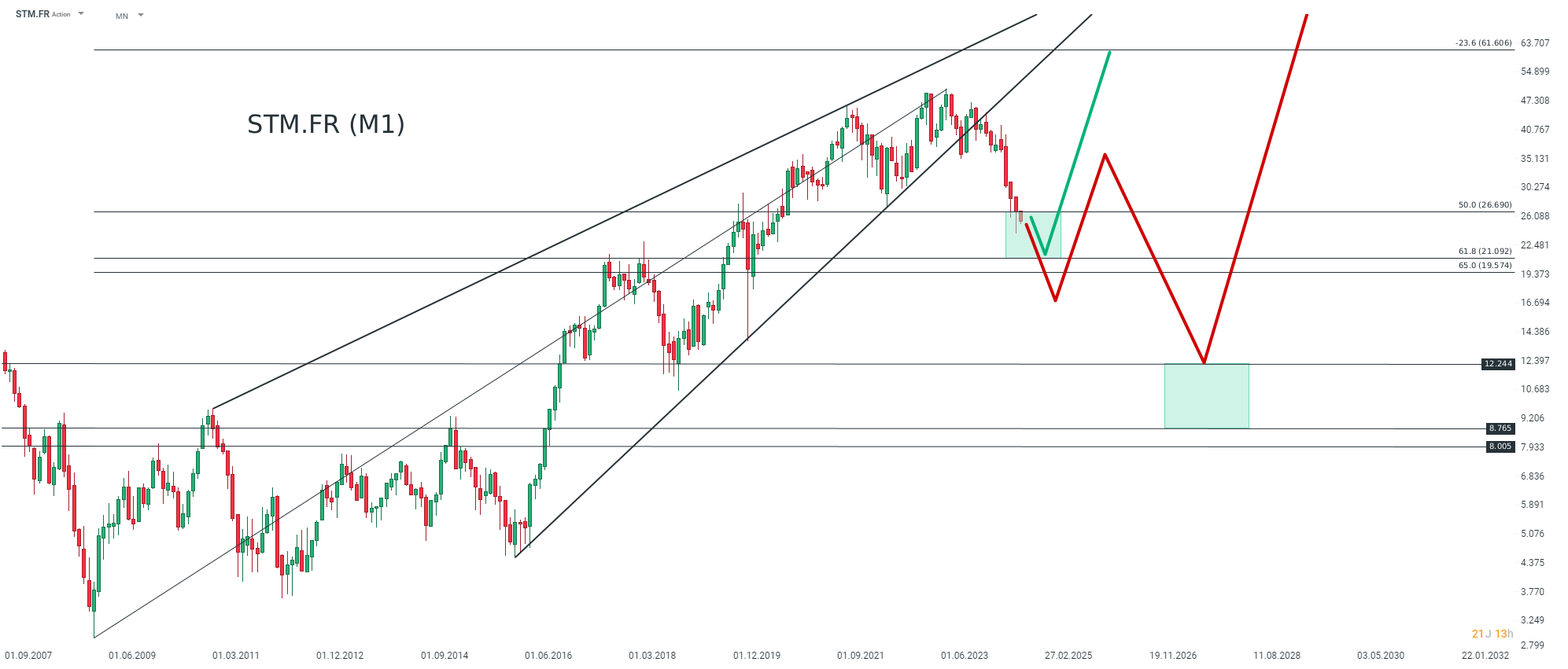 STM pourrait en effet corriger la tendance haussière établie depuis le début du marché haussier historique dans les indices (mars 2009). Si le secteur automobile ne se redresse pas rapidement ou si les droits de douane sur les véhicules chinois sont inefficaces, la zone de support entre 8,76 et 12,25 euros pourrait être atteinte dans les années à venir. Ce niveau a été déterminé par des retracements clés de Fibonacci en échelle logarithmique.