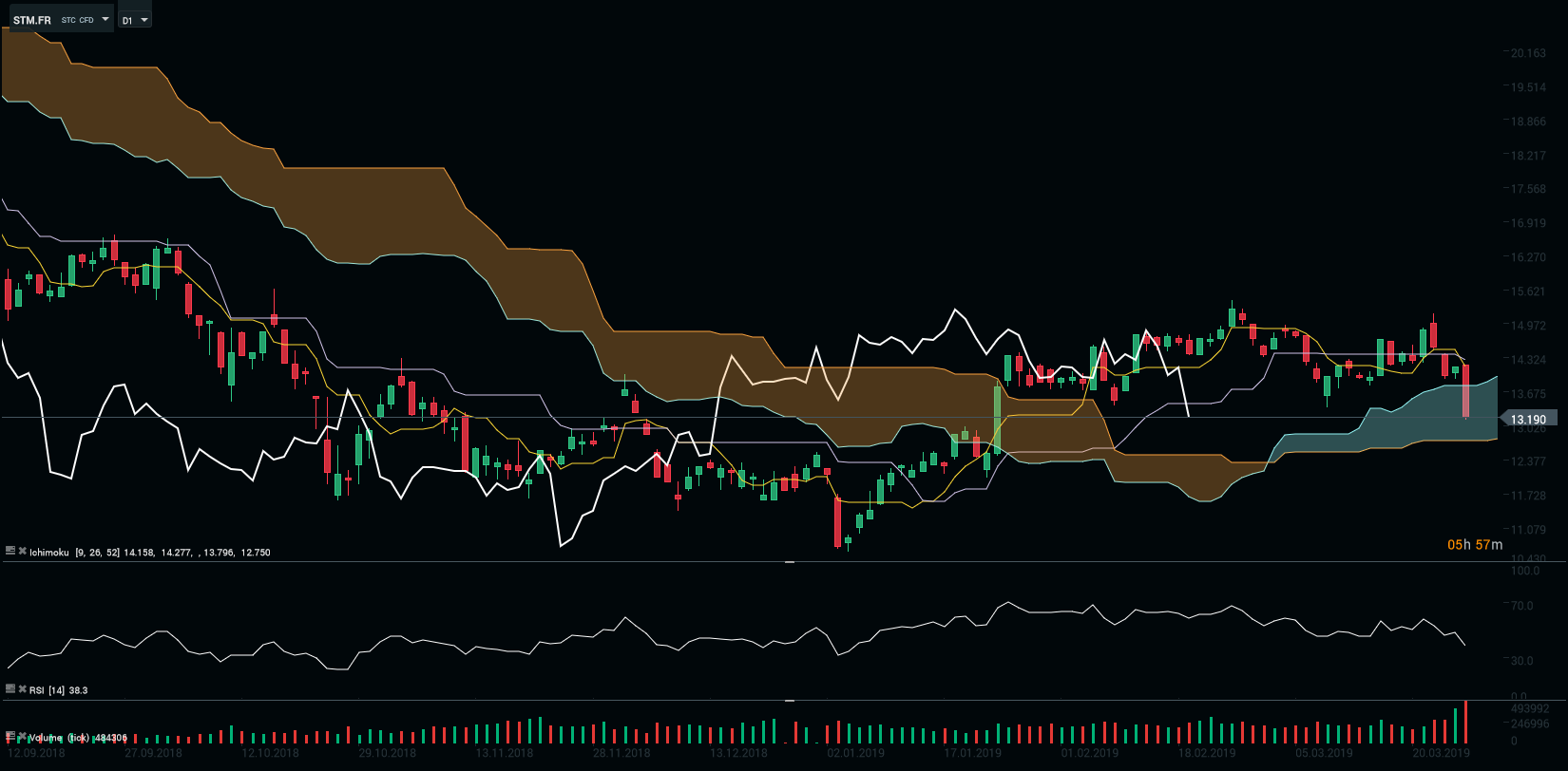 Sur le plan technique, en horizon journalier (D1), les prix sont capés par les courbes « Tenkan » et « Kiljun ». Le titre a plongé dans le nuage bleu « Kumo » en franchissant la « SSA » (courbe bleu), mais la «SSB » joue le rôle de support. La « laggin span » (courbe blanche), à l’instar du RSI (38,3), est orienté à la baisse. Nous avons un biais baissier sur le titre à court terme.