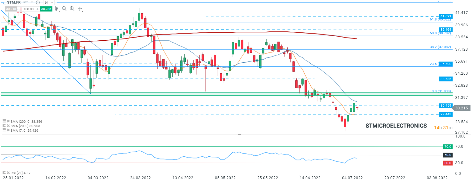 Les cours de STMicroelectronics (STM.FR) ont entamé la première séance de la semaine à la baisse malgré l’annonce positive de la création d’une usine de semi-conducteurs. Au moment de la rédaction de ces lignes, les cours se dirigent vers le support à 29,443. Les perspectives baissières sur le titre sont renforcées par le fait que le RSI évolue en dessous de la zone de neutralité de 50. Toutefois, en cas de retournement de tendance, la résistance à 31,838 constitue la prochaine cible pour les acheteurs. Source : xStation5
