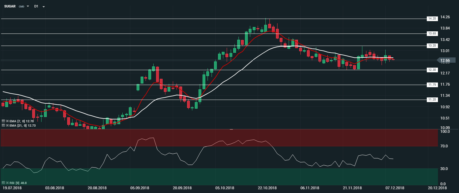 En unité de temps journalière (D1), le sucre (SUGAR) évolue en tendance baissière. Les cours sont capés par les moyennes à 7 et 21 périodes. Le RSI tend à s’aplatir proche de sa zone de neutralité et oscille à 46,8 points. Dans ce contexte, nous serons baissiers sur l’actif, avec comme objectif le niveau des 12,30 $ - et par extension le niveau des 11,75 $.