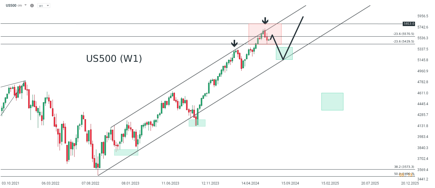 Le S&P 500 a été rejeté par sa résistance géométrique, qui conflue avec plusieurs cibles institutionnelles de prises de profit (boîte rouge). Cette semaine, si l’indice phare américain atteint un nouveau plus bas en raison de résultats trimestriels décevants des géants de la tech, la bande verte des 5130 à 5235 pourrait être visitée. Une explosion de la bulle de l’IA pourrait nous envoyer à 4350, soit une baisse supplémentaire de 21 %, offrant ainsi aux investisseurs une opportunité majeure. Cependant, nous en sommes encore loin. Source : xStation.