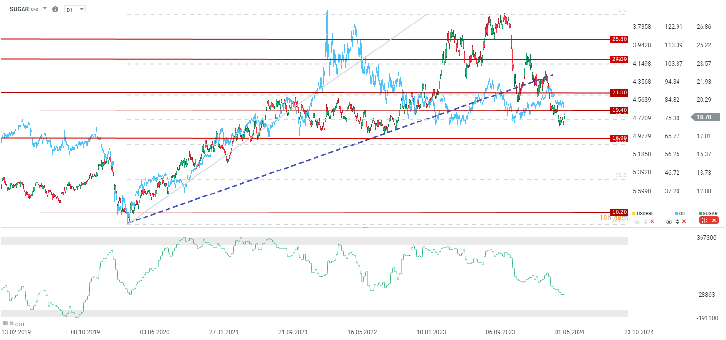 La baisse des prix du pétrole est également un facteur négatif pour les prix du sucre en raison de la réduction de la demande de biocarburants produits à partir de la canne à sucre. Source: xStation5