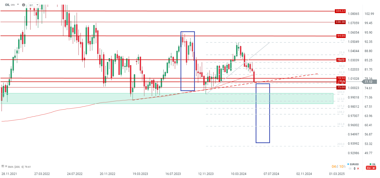 Le prix du pétrole Brent a chuté de 5 % suite à la décision de l'OPEP+. Actuellement, des niveaux de soutien importants sont testés autour de 77 dollars le baril, le retracement de 78,6 % de la dernière vague de baisse et la ligne de tendance ascendante qui est également la ligne de cou de la formation tête-épaules. Le prochain niveau de soutien important se situe autour de 69-72 dollars le baril. Source: Bloomberg Finance LP, XTB