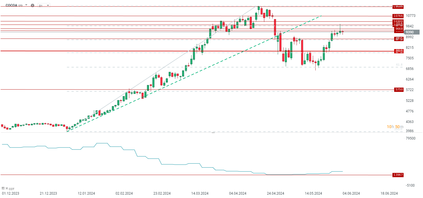 Le prix teste 10 000 dollars la tonne, formant une étoile filante potentielle. Un repli en dessous de 8 800 $ pourrait conduire à un test autour de 8 000 $. Source: xStation5