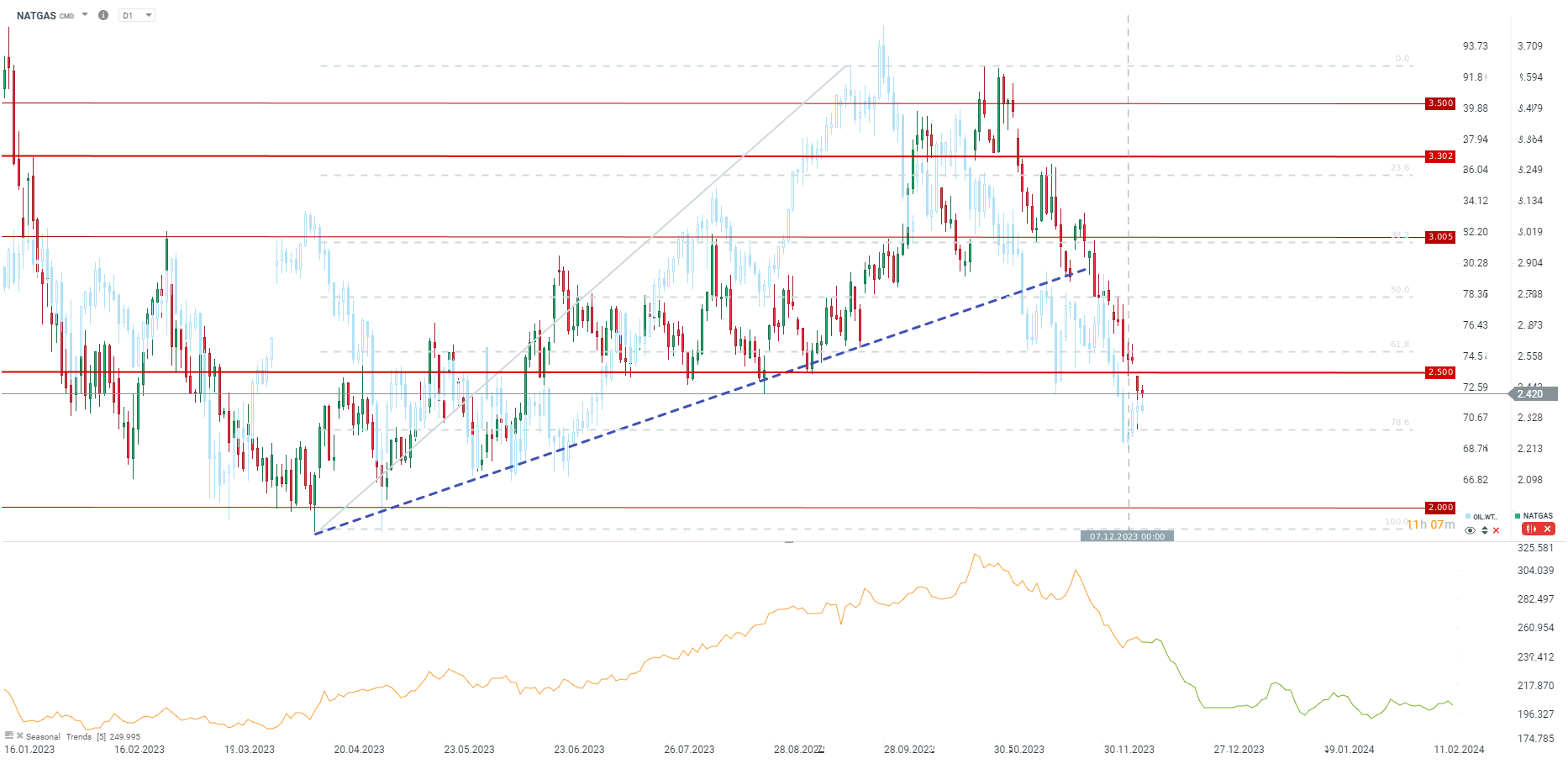 NATGAS a chuté en dessous de 2,30$ par MMBTu au début de cette semaine mais a récupéré une partie de ses pertes par la suite. Les 2,50$ devraient être considérés comme une résistance clé pour le moment. Les tendances saisonnières suggèrent que les baisses pourraient reprendre dans la seconde moitié du mois.Source: xStation5