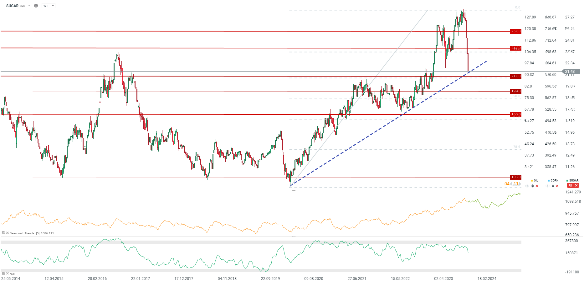 Le sucre a chuté de plus de 20% par rapport à son récent sommet. Le soutien clé se trouve dans la zone des 21 cents par livre, près du retracement de 38,2% du mouvement à la hausse. Il convient de noter que la saisonnalité suggère une période de fluctuation à court terme. Source: xStation5