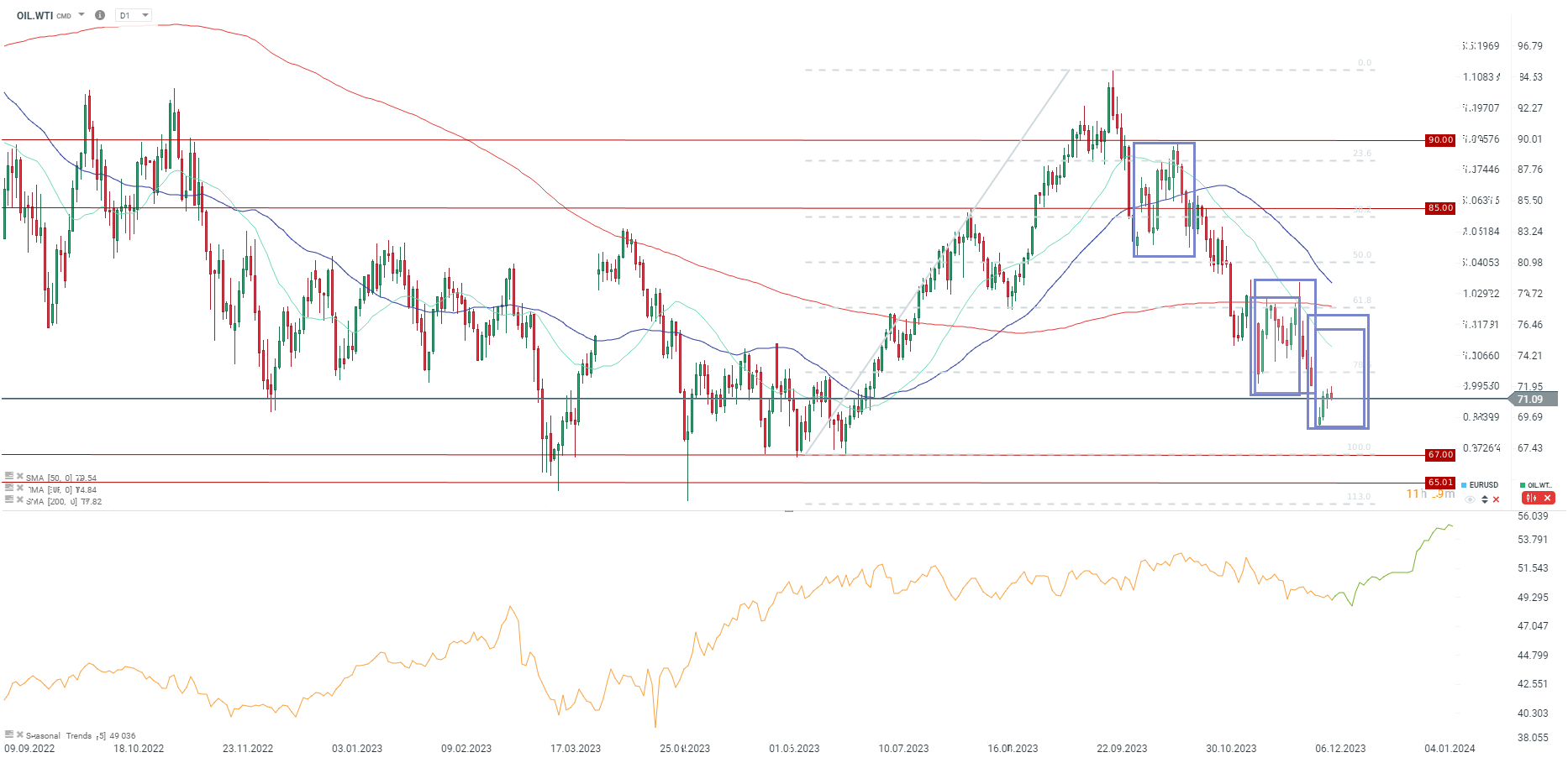 WTI (OIL.WTI) a récupéré une partie de ses pertes récentes après avoir atteint et testé la zone des 65-67 dollars. La saisonnalité suggère la possibilité d'un mouvement haussier dans la seconde moitié de décembre. Un niveau de résistance clé à surveiller se trouve près du retracement de 78,6% (zone des 73 $) ainsi que la limite supérieure d'une correction récente (zone des 75-76 $). Source: xStation5