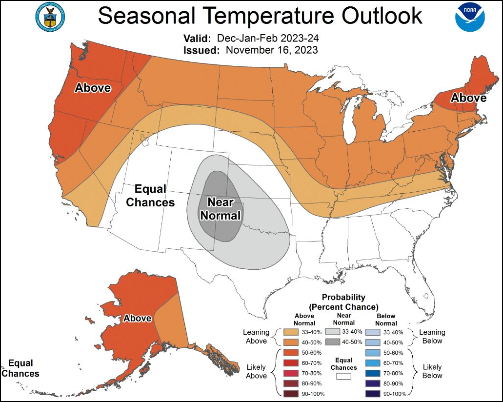 - Les prévisions saisonnières pour tout l'hiver indiquent que les températures dans le nord des États-Unis devraient être plus élevées que la normale.