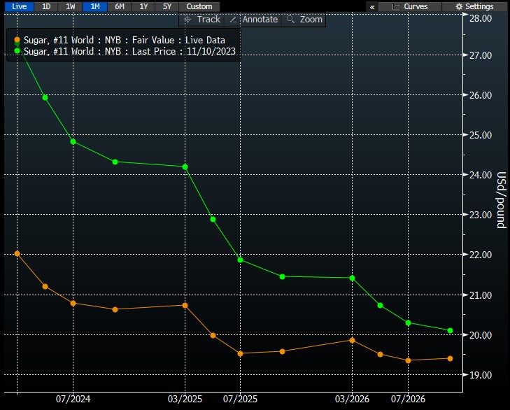 Les prix du sucre ont chuté de manière significative mais la courbe des contrats à terme reste en déport (bien qu'elle soit moins importante qu'il y a un mois). Source: Bloomberg Finance LP