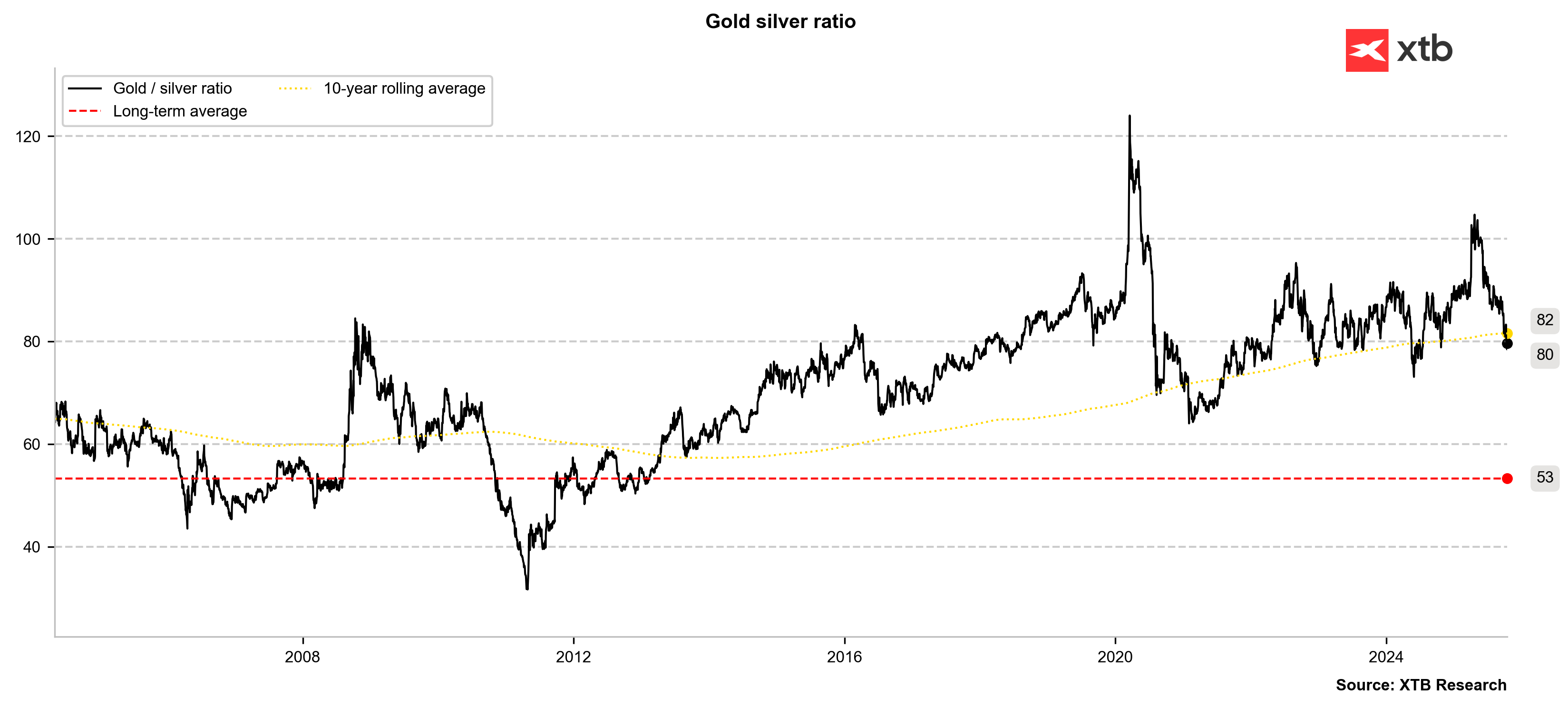 Le ratio cours de l'or/cours de l'argent reste inférieur à la moyenne mobile sur 10 ans, ce qui pourrait indiquer une possibilité de poursuite de la forte tendance haussière de l'argent. Néanmoins, au cours des quatre dernières années, un rebond à partir d'environ 78-80 points s'est souvent produit, entraînant des corrections plus importantes de l'argent. Source : Bloomberg Finance LP, XTB