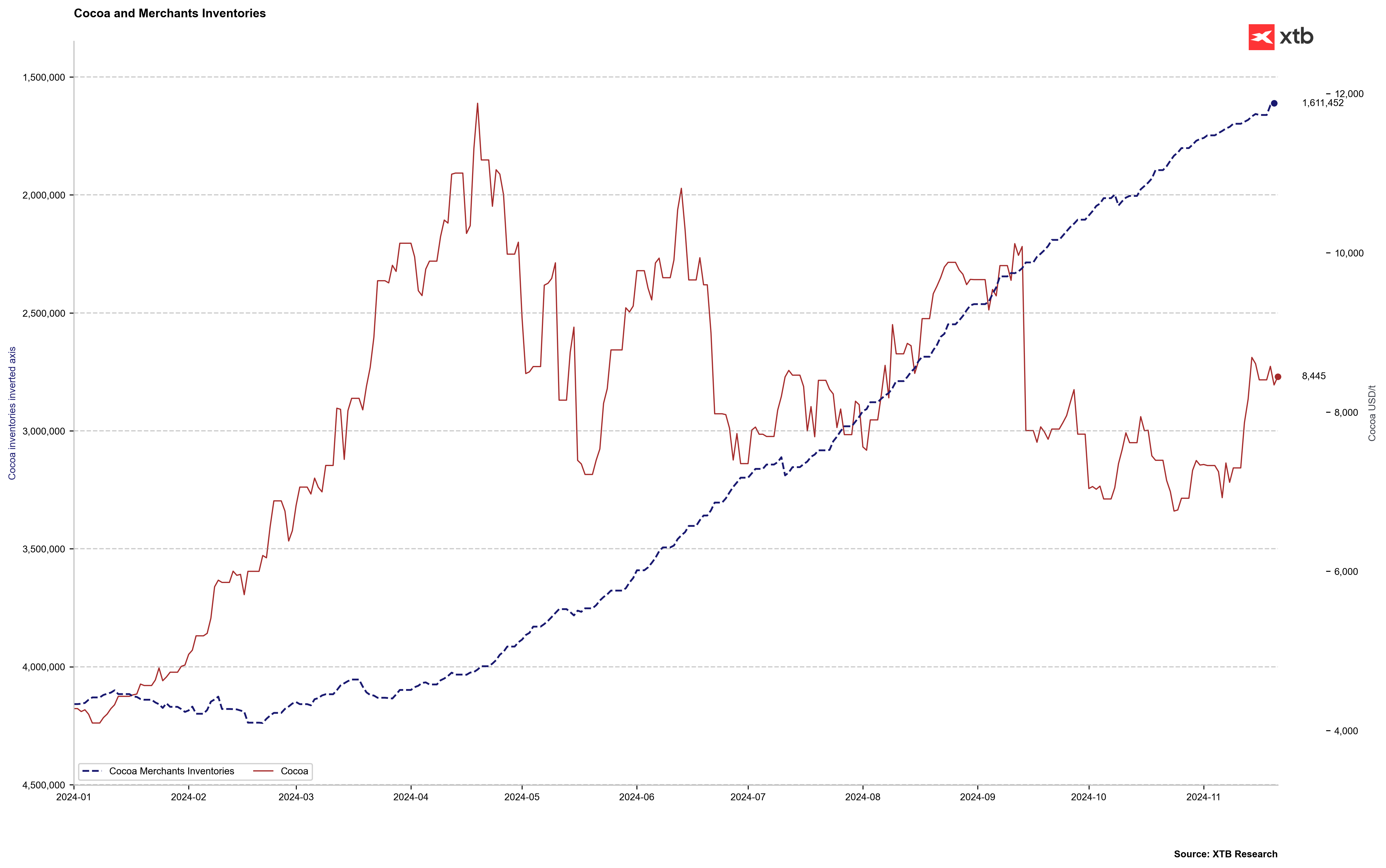 Il est intéressant de noter qu'une divergence se dessine actuellement sous la forme d'une baisse des prix et d'une diminution significative des stocks de cacao, qui sont à nouveau nettement inférieurs à 2 millions de sacs. Source : Bloomberg Finance LP, XTB