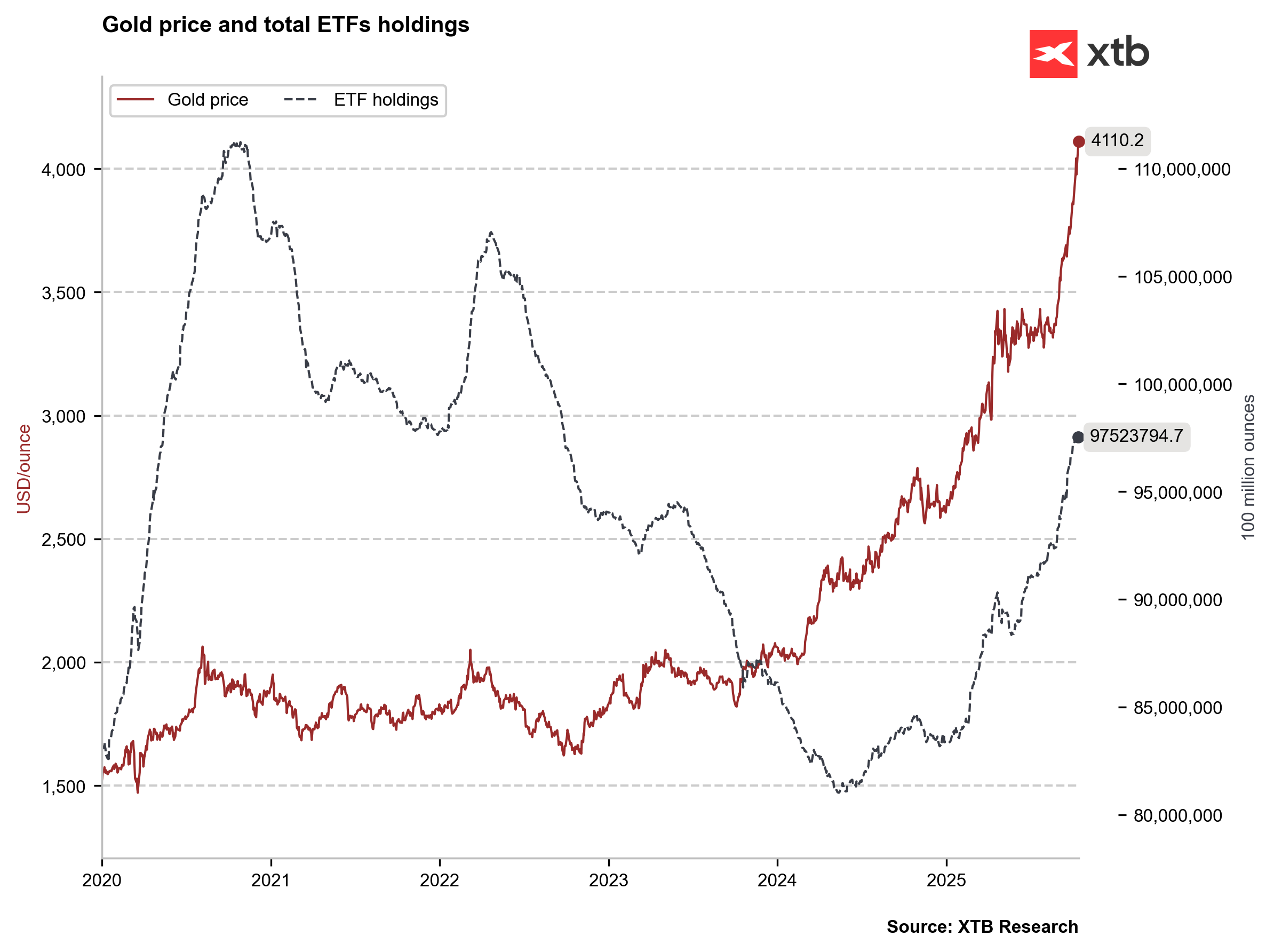 Les ETF continuent d'acheter de l'or à un rythme soutenu, bien que légèrement inférieur à celui de l'année record 2020. Le comportement des ETF constituera un signal important pour la poursuite de la tendance haussière ou un signal de correction. Source : Bloomberg Finance LP, XTB