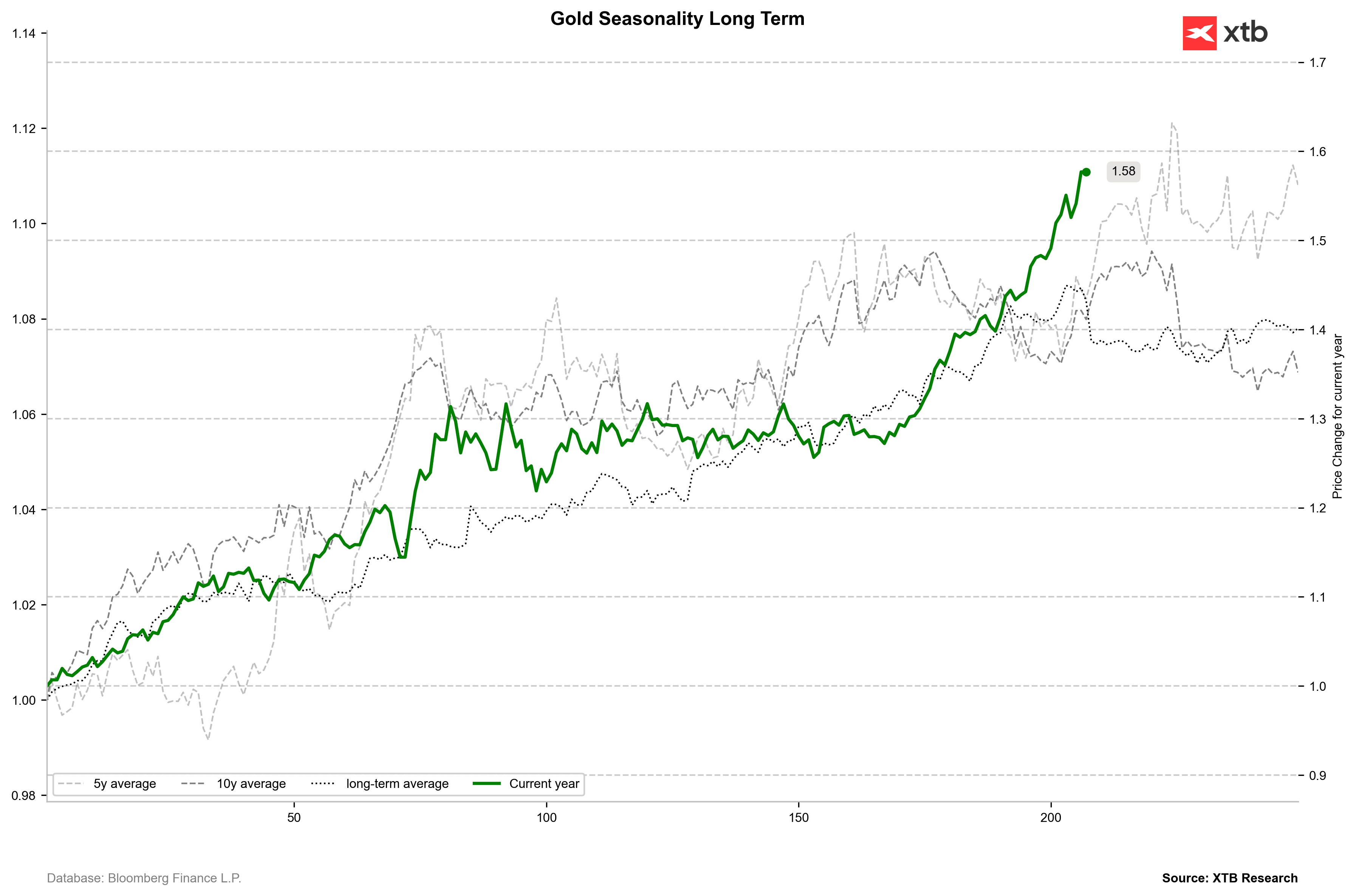 Le prix se situe à un niveau où un creux local était généralement observé avant un rebond à la fin du mois. Le moment ultime pour un rebond est la fin du mois d'octobre. Source : Bloomberg Finance LP, XTB