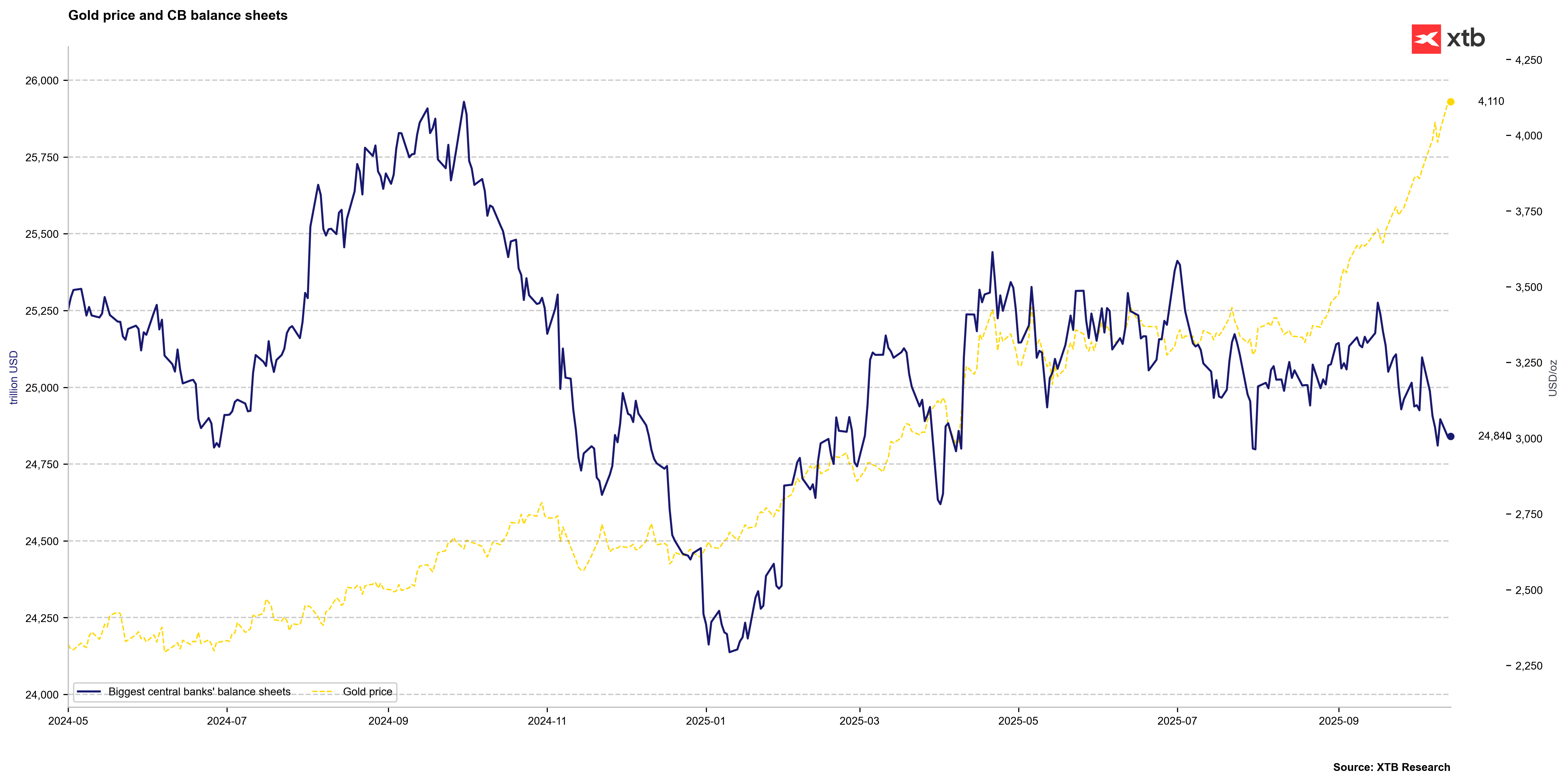 Récemment, nous avons observé une nette diminution des bilans des quatre plus grandes banques centrales du monde. Bien que cela ne soit pas nécessairement un facteur négatif, compte tenu de la perspective de baisses des taux d'intérêt, il convient de noter que la phase de croissance observée au début de cette année était liée à l'assouplissement de la situation monétaire. Source : Bloomberg Finance LP, XTB