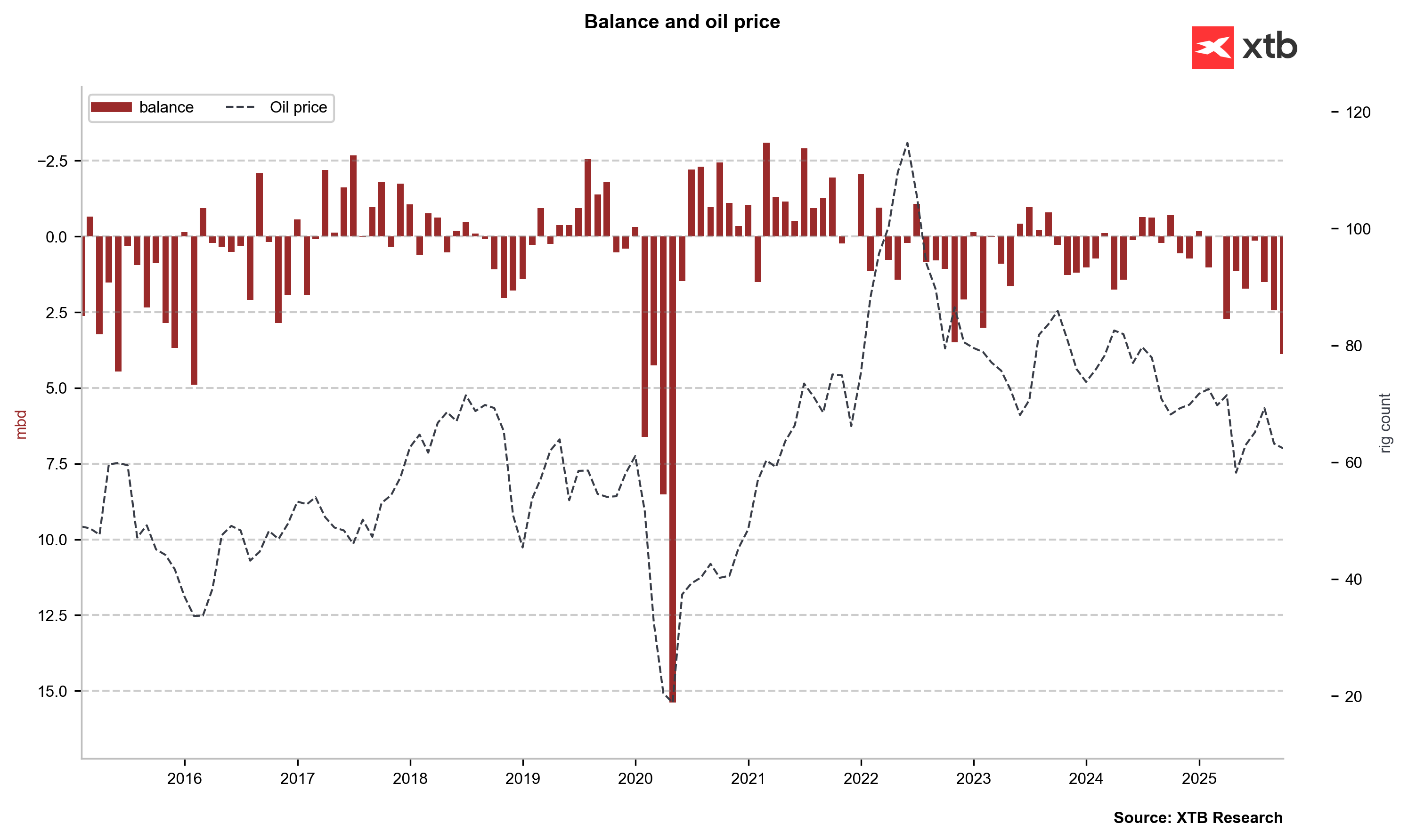 L'offre excédentaire actuelle sur le marché du pétrole augmente et continuera de croître dans les mois à venir, à moins d'une reprise de la demande ou d'un effondrement de l'offre, par exemple en provenance de Russie. Source : Bloomberg Finance LP, XTB