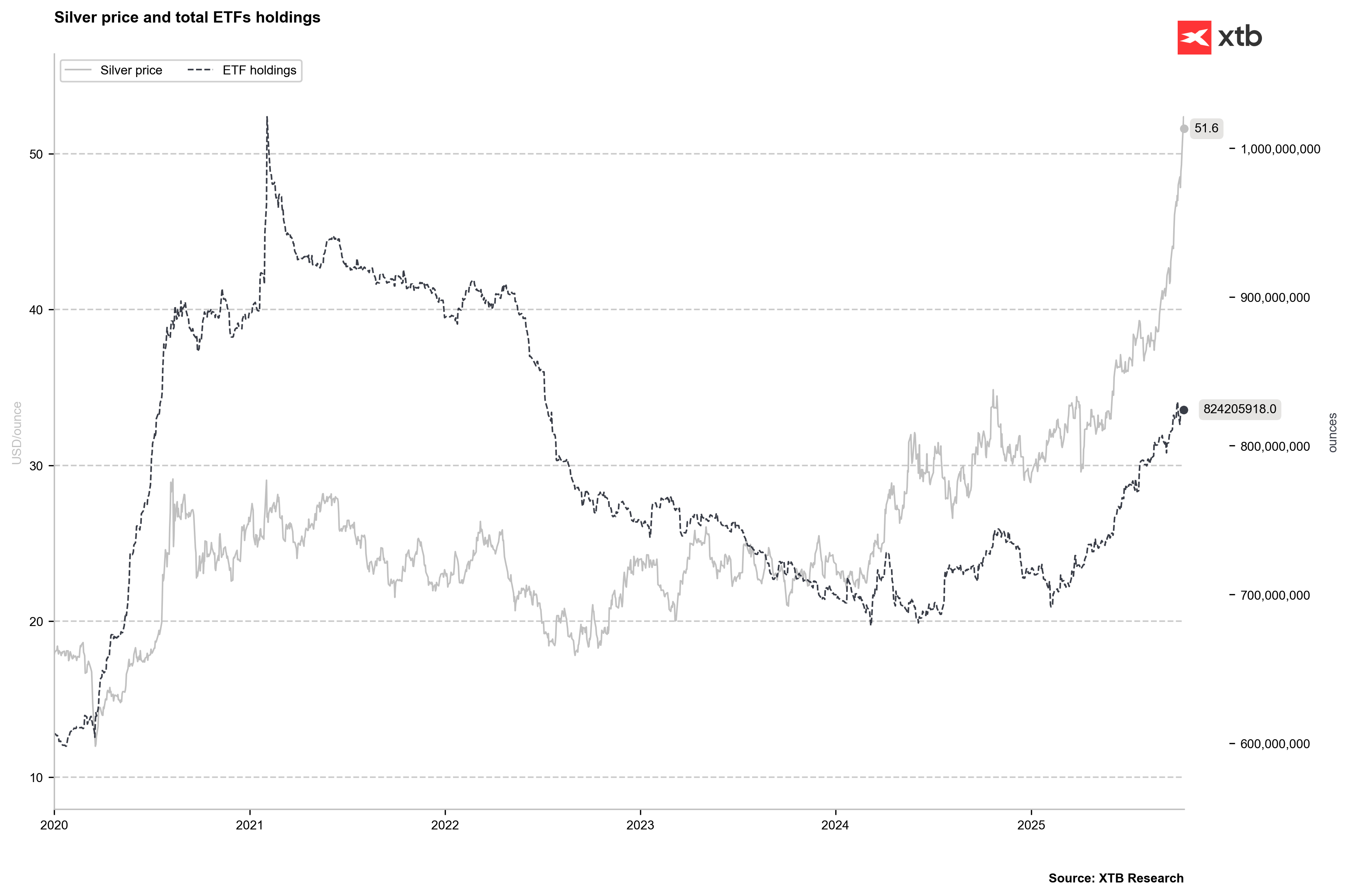 Les ETF continuent d'acheter de l'argent, bien que la dynamique de hausse soit moins forte qu'en 2020. Source : Bloomberg Finance LP, XTB