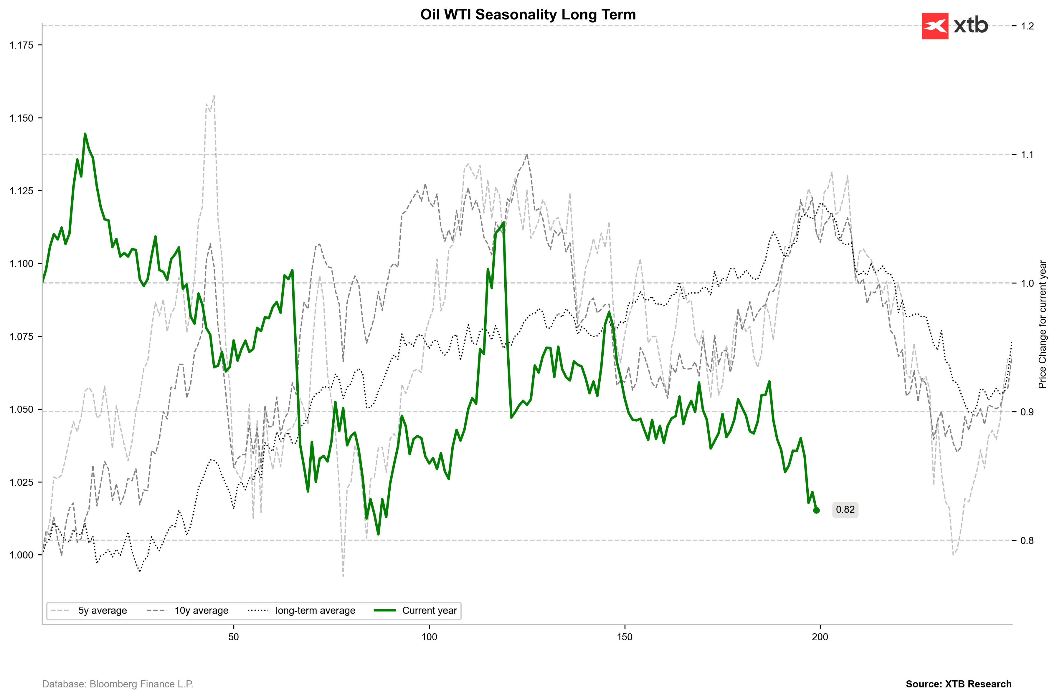 La saisonnalité indique que nous devrions actuellement être au sommet des prix, tandis que les semaines à venir devraient être marquées par une vague de ventes. Source : Bloomberg Finance LP, XTB
