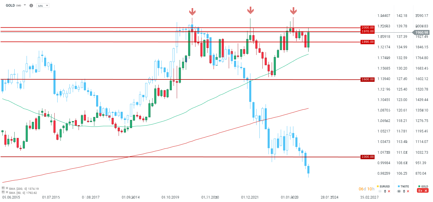 - À court terme, une correction sur le marché de l'or est possible. Au cours des derniers mois, le prix n'a pas clôturé une seule fois au-dessus de 2 000 dollars (bougie mensuelle). La plage de 2 000 à 2 100 dollars reste probablement une résistance très solide. Sans changement dans la situation financière, il est peu probable qu'il y ait une augmentation significative et durable des prix sur le marché de l'or.