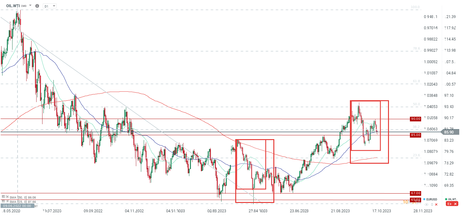 Le prix du pétrole WTI (OIL.WTI) a considérablement chuté au cours des deux derniers jours mais il semble qu'un support à 85 dollars ait été trouvé. L'absence d'escalade au Moyen-Orient a réduit les préoccupations concernant l'approvisionnement en pétrole. D'un point de vue fondamental, il reste une possibilité pour que le prix du pétrole atteigne les 100 dollars le baril. Source: xStation5