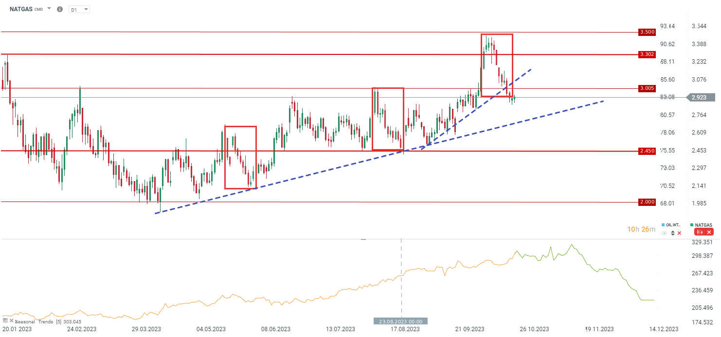 Les prix du gaz ont franchi la limite de la plus grande correction dans la tendance haussière actuelle mais devraient revenir au-dessus de 3,00 dollars par MMBTu après le renouvellement d'aujourd'hui. À moins que les perspectives météorologiques aux États-Unis ne changent, il y a de fortes chances que l'écart de prix soit comblé ultérieurement. Source: xStation5