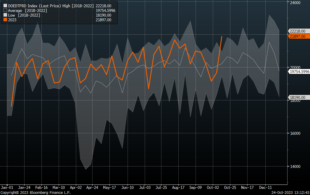 Les produits totaux fournis sur le marché américain ont dépassé la moyenne sur cinq ans pour la période, ce qui peut indiquer une forte demande ou une augmentation des taux de fonctionnement des raffineries. Source: Bloomberg Finance LP